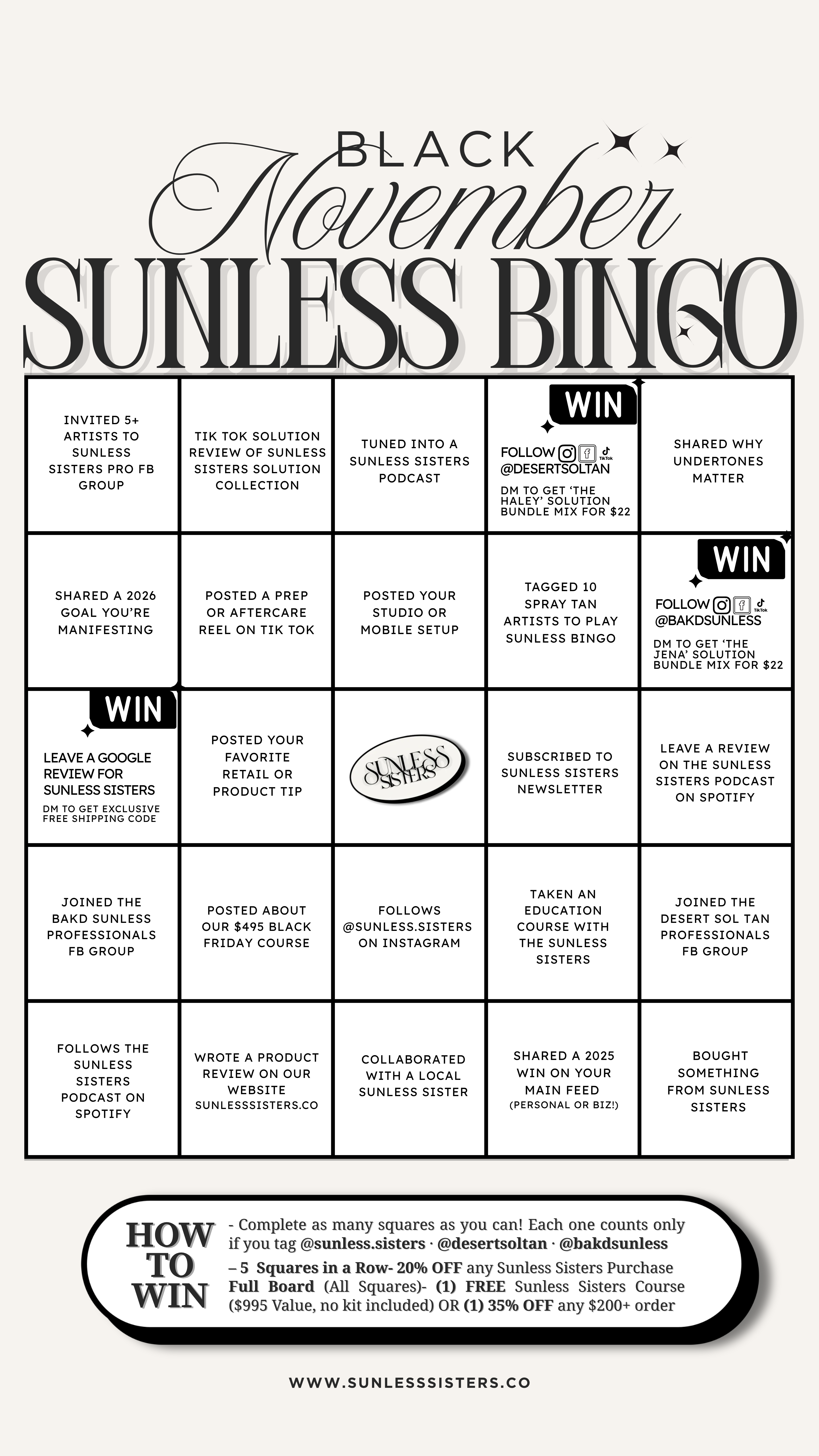 This November, we're celebrating Black Friday deals all month long! Enroll in the Sunless Sisters Online Spray Tan Certification Course and save big when you use code MONEYMOVES at checkout.